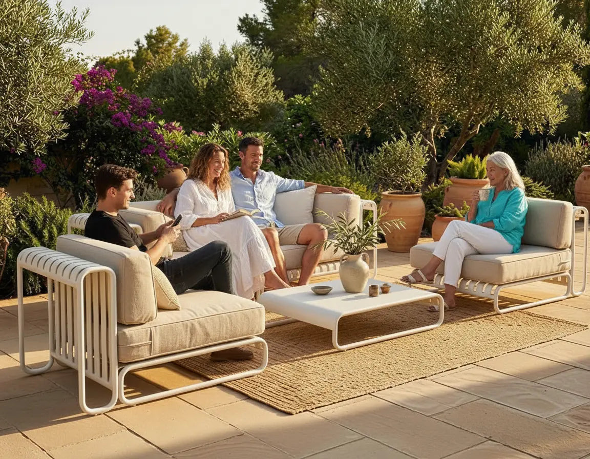 Set con sofá y dos banquetas acolchadas con plataformas integradas, elegante y versátil, ideal para espacios modernos y exterior.