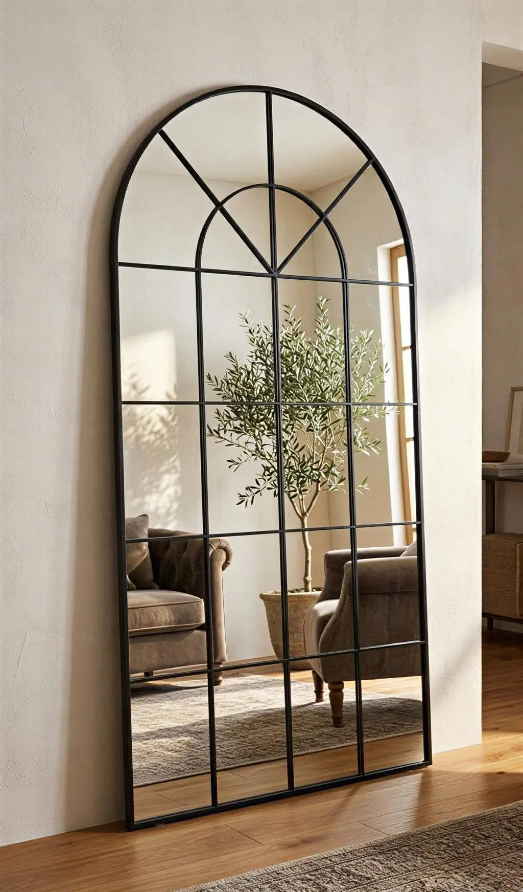 Espejo de pie elegante que amplía espacios y aporta estilo y luz a cualquier rincón del hogar.
