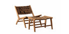 Sillón con reposapiés de madera y fibra natural, diseño cómodo y elegante para espacios cálidos.