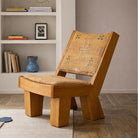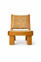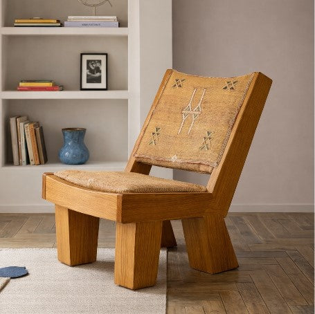 Silla de madera Origins con diseño artesanal y asiento textil, perfecta para ambientes cálidos.