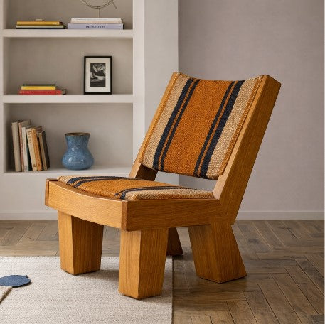 Silla de madera Origins con diseño artesanal y asiento textil, perfecta para ambientes cálidos.