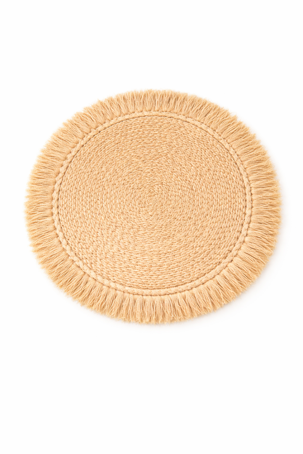 Estas alfombras redondas presentan yute claro con flecos suaves, estilo natural y luminoso.