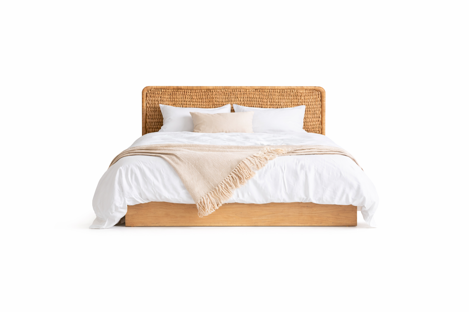 Cama Origins de madera y ratán natural, diseño cálido y elegante para un descanso sereno.