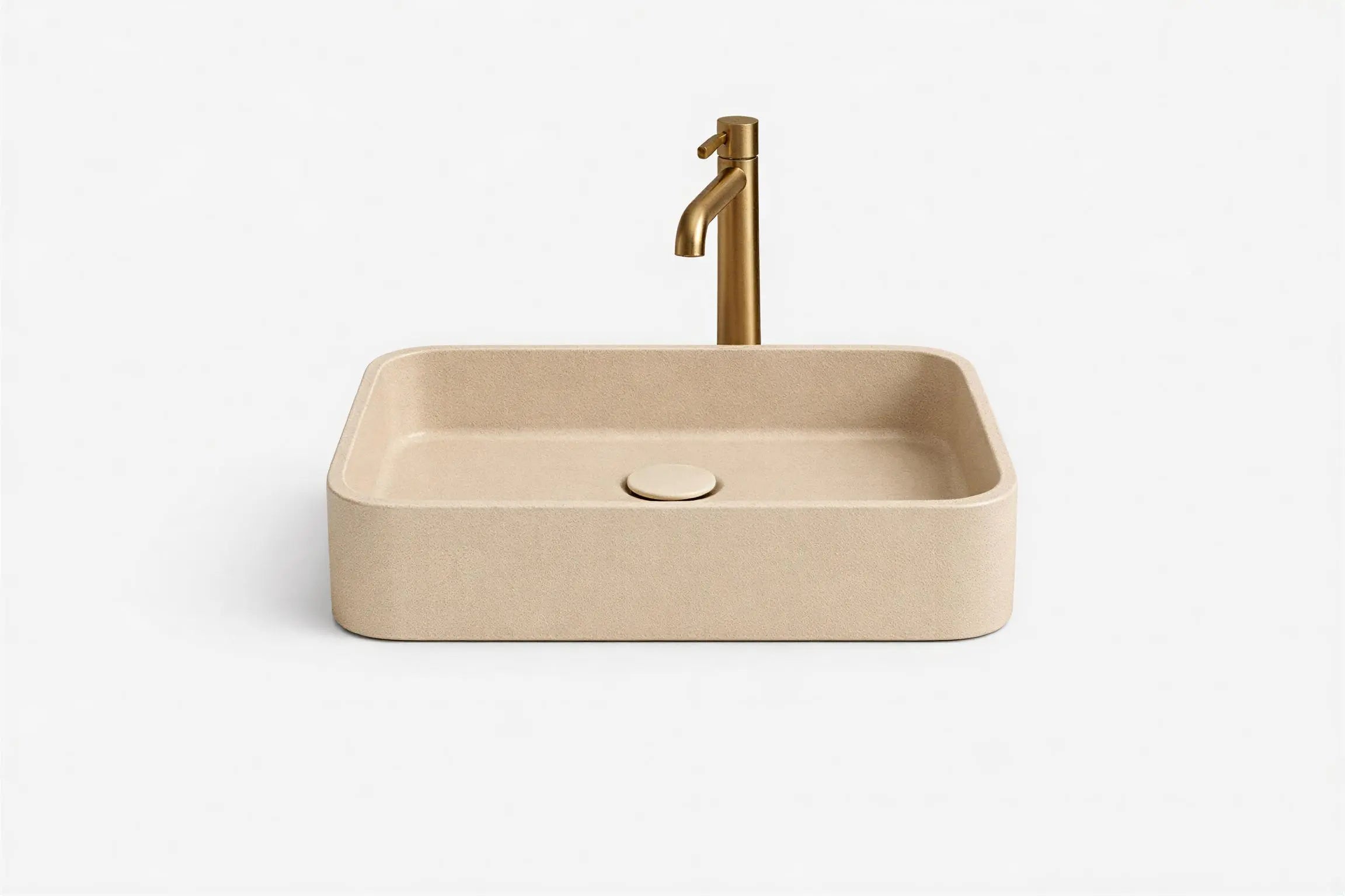 Lavamanos cuadrado Origins en tono arena con grifería dorada, diseño moderno y elegante para baño.