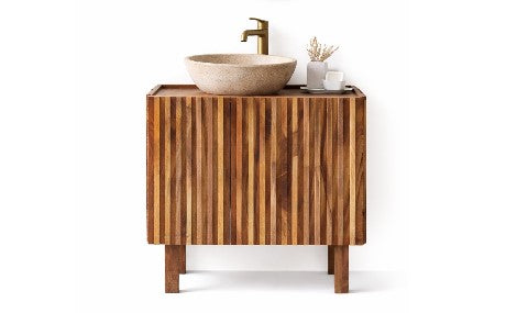 Mueble de baño Origins: diseño natural y elegante, con madera cálida y estilo minimalista.
