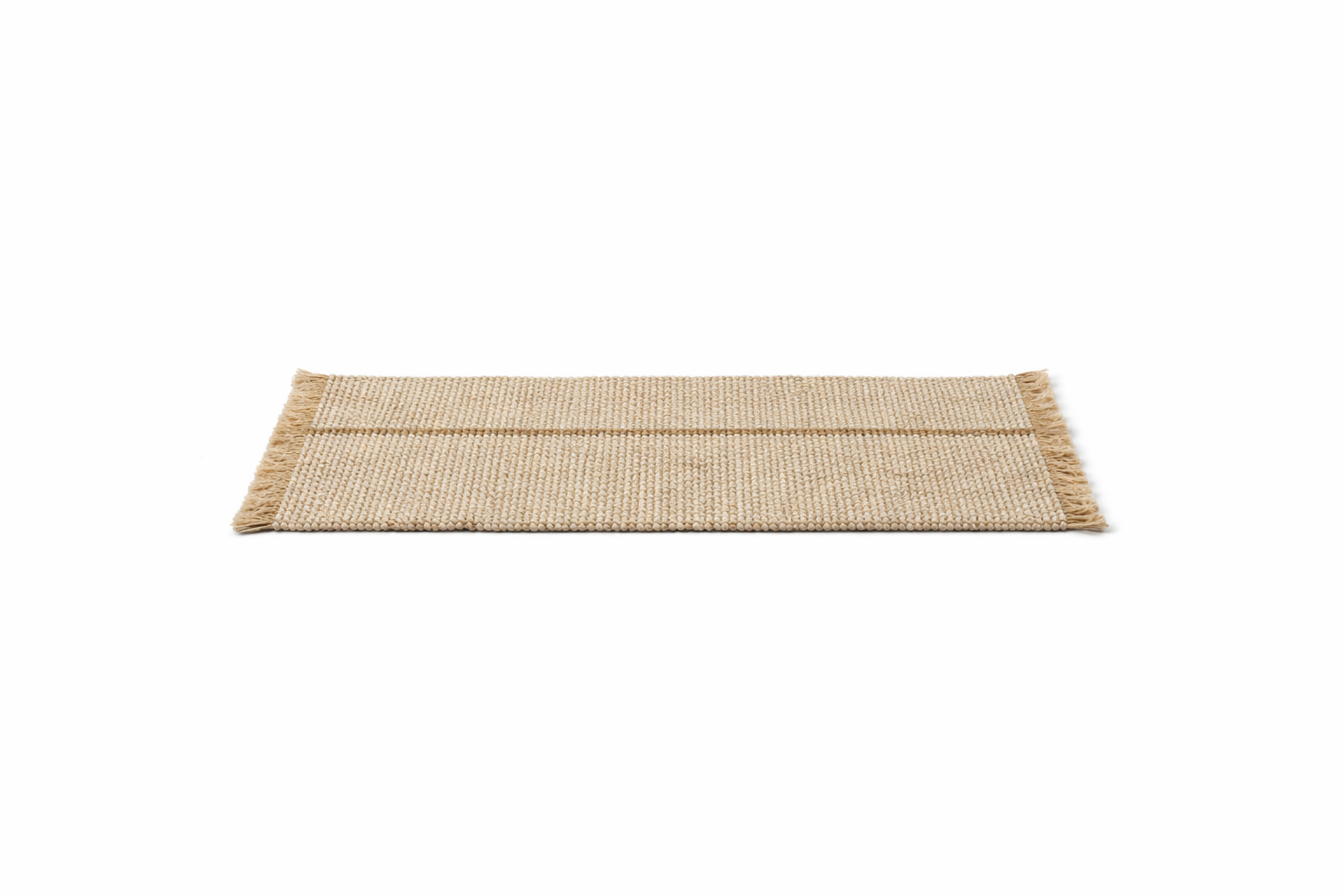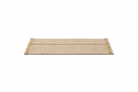 Alfombra de yute beige con textura natural y flecos en los extremos, sobre fondo blanco amplio.