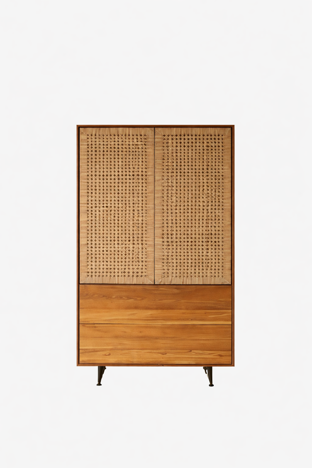 Armario de madera con puertas de rejilla natural y cajones, estilo nórdico cálido y elegante.