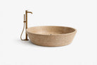 Bañera exenta de piedra travertino con grifería dorada, diseño natural, elegante y relajante.