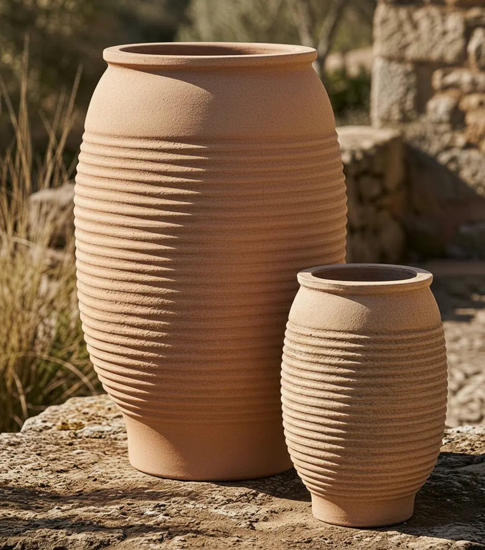 Jarrones decorativos artesanales de cerámica, estilo rústico y natural para interior o exterior.