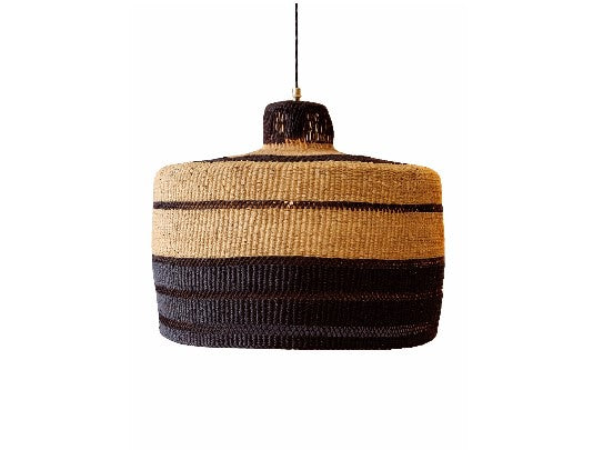 Lámpara artesanal de fibra natural en tonos beige y negro, diseño moderno y cálido para interiores.