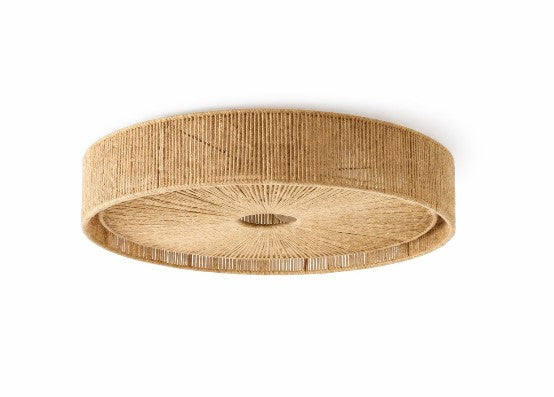 Lámpara de techo redonda en fibra tejida, diseño elegante y cálido para iluminar espacios modernos.