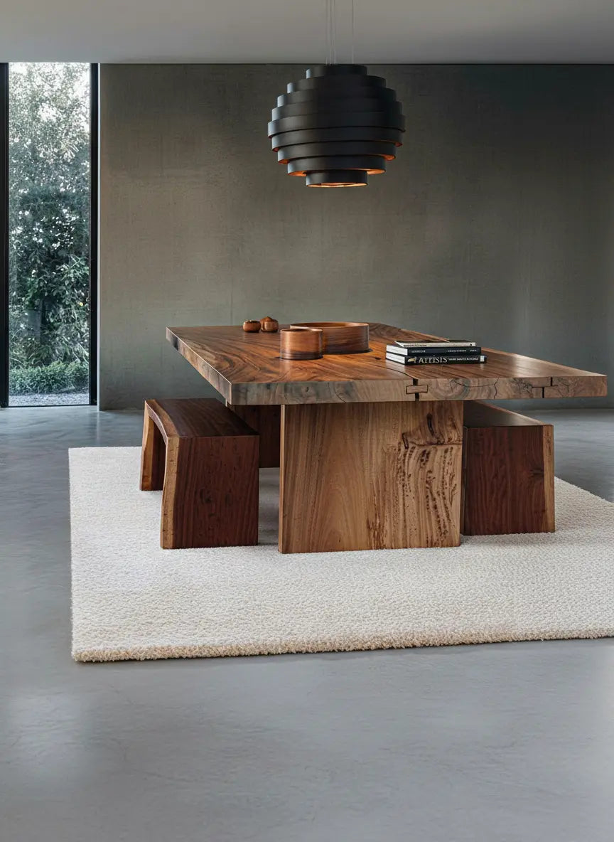 Mesa de madera con asientos: diseño resistente y elegante, ideal para comedor, terraza o espacios familiares.