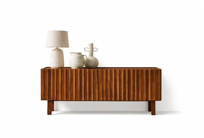 Consola Origins de madera maciza con líneas verticales y estilo cálido, elegante y natural.