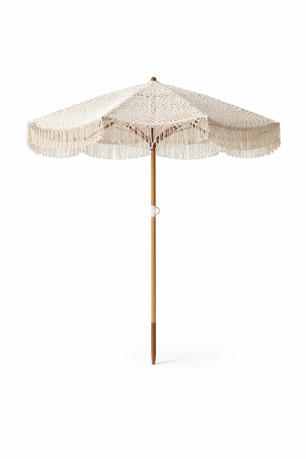 Estas sombrillas presentan tejido artesanal con flecos y estilo boho, ideales para exteriores.